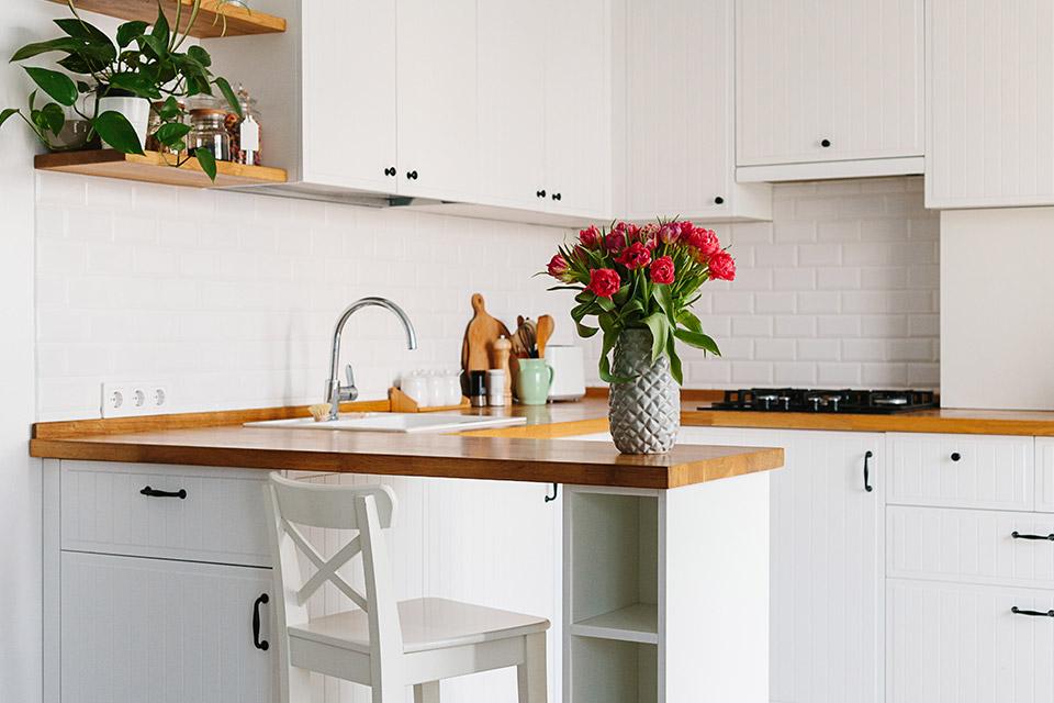 Table top counter with blurred kitchen interior background.