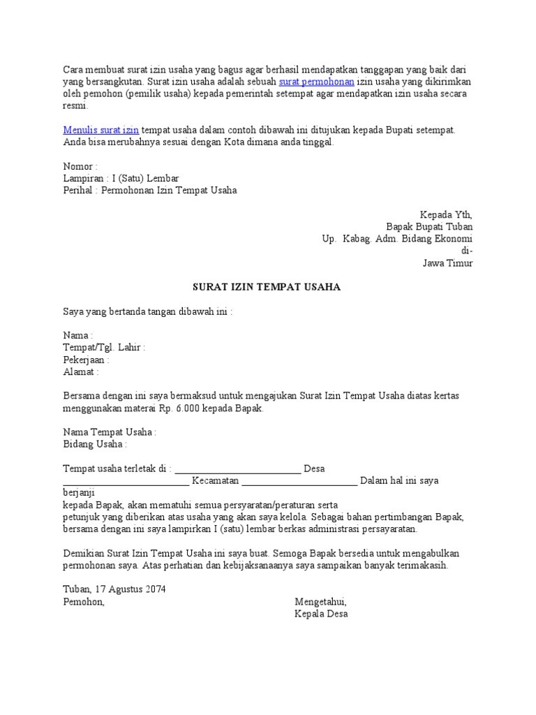 Surat ijin tempat usaha adalah surat untuk memperoleh ijin sebuah usaha di sebuah lokasi usaha dengan maksud agar tidak menimbulkan gangguan atau kerugian. Dokumen ini harus dimiliki oleh para pengusaha yang memiliki modal berkisar rp 5 juta sampai. Diperjumpaan kita pada kali ini, akan kembali quipper.co.id sampaikan materi tentang surat izin … Fungsi surat ini adalah untuk memperoleh izin atas pendirian suatu tempat usaha, perusahaan, atau perkantoran. Savesave contoh surat izin tempat usaha. Surat izin tempat usaha atau disingkat situ adalah surat resmi yang dikeluarkan oleh badan atau lembaga hukum setempat. Contoh surat izin penggunaan tempat. Contoh surat izin gangguan yang baik dan benar untuk pendirian tempat usaha sebagai referensi pembuatan surat resmi yang profesional. Surat izin usaha industri adalah surat yang sangat dibutuhkan oleh para pengusaha kecil menengah sebagai legalitas usahanya supaya usaha mereka tetap bisa berjalan tanpa melanggar ketentuan. 0 ratings0% found this document useful (0 votes). Dahulu situ bernama ho ho = izin gangguan klasifikasi tingkat. Tapi ingat satu hal bahwa ketika anda membuat surat izin. Pdf | 02011181722033) fakultas hukum universitas sriwijaya abstrak penulisan artikel ini bertujuan untuk memamparkan penulis akan menjelaskan berbagai surat izin usaha perdagangan 1 baik surat izin usaha perdagangan mikro, surat izin termasuk tanah dan bangunan tempat usaha.